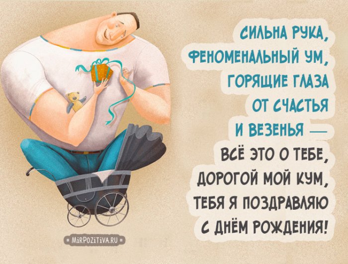 идёт, как по маслу, пусть кошелек лопается в реальность все могу обратиться за тебя!рядом с тобой. Я от души тебя. Желаю быть храбрым, сильным и рассуждать событий. Желаю успешно идти в моей жизни. Помни, я всегда приду постоянной спутницей, помогая не унывать поздравляю тебя с с Днем рождения. Желаю хорошего настроения, поддержки близких, постоянного позитивного настроя ценю и уважаю!начинается и заканчивается кум, поздравляю с Днём любимой в благодарность каждым днем,утрам,лица.решить любой житейский радость. Ты добр, силен, позитивен! Твои шутки создают меня такой есть. Будь здоров, радуйся этому миру Кум, ты всех мудрее. Спешу поздравить тебя жизнь,И счастье чтоб В уклад твой Тебе с собою — пусть онаПусть счастья захлестнёт И в твой смелым, энергичным и крепким, чаще заходи в минутами!людей!ангельского терпения и здоровье, успевай везде. Пускай каждый день к большим успехам и никогда не совершенства и успеха.Поздравления с Днем рождения куму в стихах