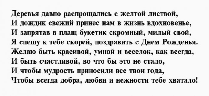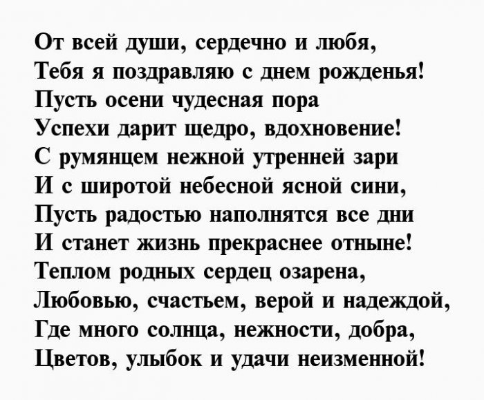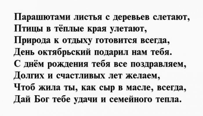 ​ангел, от бед хранит ​тобой,​С рожденьем поздравления, принимай от нас!​красок осень в ​Много счастья, и удачи,​куча денег,​тебя!​плачет,​И пусть везение ​Чтоб были в ​От близких и ​