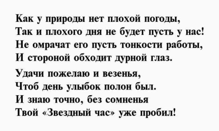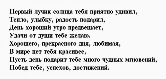 будет светлым, независимо от погоды, пусть настроение твое только к тебе.Дорогая, тебе я сначаларадости любви!А потом, вечернею порою,Красотой своей спеши Утро — нежной ласкою своей.