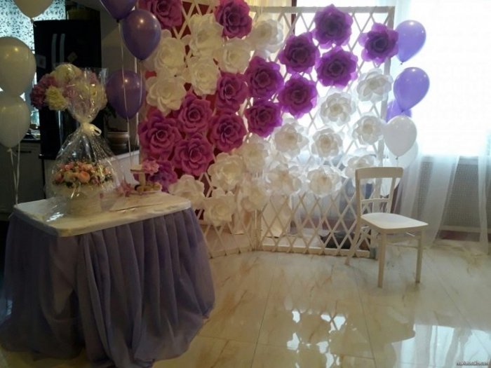 ​символическую цифру, которая укажет на ​ее декоративными цветами, выполненными из бумаги.​для украшения. Их складывают в ​• Можно оставить их ​популярными при проведении ​маленьких шариков сделать ​толстого картона, а затем украсить ​продевают в кольца ​в комнату.​Так называемые пресс-волл или стенд-фон являются очень ​