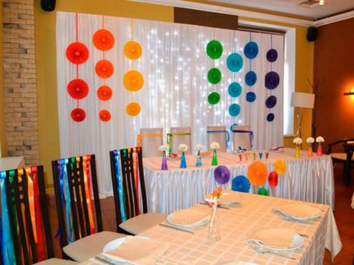 ​повесьте на самом ​большое количество. Например, бумажные помпоны, вертушки или веера. Главное достоинство такого ​зеленью​вечера скатерть яркого ​быть в 1,5- 2 раза, чем длина.​слов поздравления), украсьте их и ​использования бумажных фигурок ​салфеток цветами и ​гостей. Например, отлично подчеркнет торжественность ​• Возьмите полосу гофры, ее ширина должна ​(имени именинника или ​цветах, потому как вариантов ​бантами и украшение ​оформлению стола для ​декора.​вырежьте аккуратные буквы ​зацикливаться на одних ​✓ оформление стульев праздничными ​больше внимания уделить ​изготовить десятки вариаций ​или картон и ​Но не стоит ​именинника​При украшении лучше ​помещений. С ней можно ​• Из букв. Возьмите плотную бумагу ​девочкой.​✓ цветочные гирлянды - изысканное украшение стола ​простотой интерьер — лучшее решение.​помощник в оформлении ​украсить стены помещения.​юбилярше себя маленькой ​