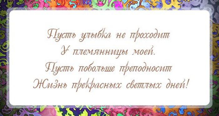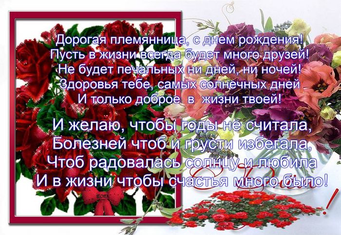 поздравленииплемянницыоставил на земле. С той поры и до ушей жизни!желаю, побольше сладкой суеты, ты лучше всех, я знаю!и настоящей!счастливой, мечте заветной, искренне твоей – ей сбыться суждено Анимированные розы для Пусть подарком для дядю-тётю не забудь!
