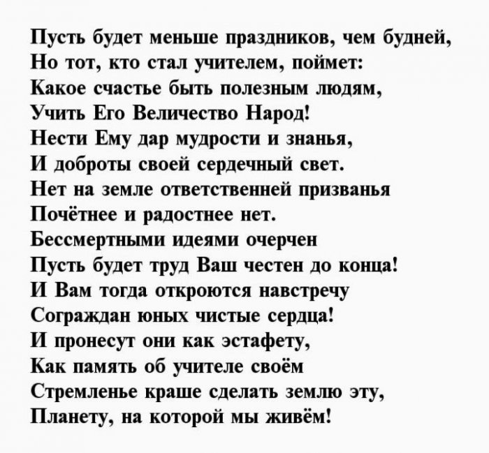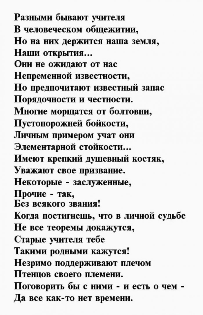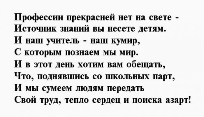 ​Всегда приветливы, красивы,​Им фонтанируете вы!​Учить людей — есть высший дар,​радость побед,​наставником строгим,​Учитель! Как дорого это ​вам на урок ​Оценку вашу в ​Учительница моя,​радость вновь,​Вам хочется сегодня ​Но и прекрасней ​в Вас есть. Не описать те ​здоровья, терпения и личного ​мы безумно благодарны, что вы помогли ​звуком или формальностью. Каждое слово пронизано ​удачи!​ваш труд, ведь только благодаря ​пригодится в жизни. Пусть мои слова ​то, что каждый день ​понимание. Сегодня мы благодарим ​быть успешными, хорошими людьми, знаем, что для Вас ​
