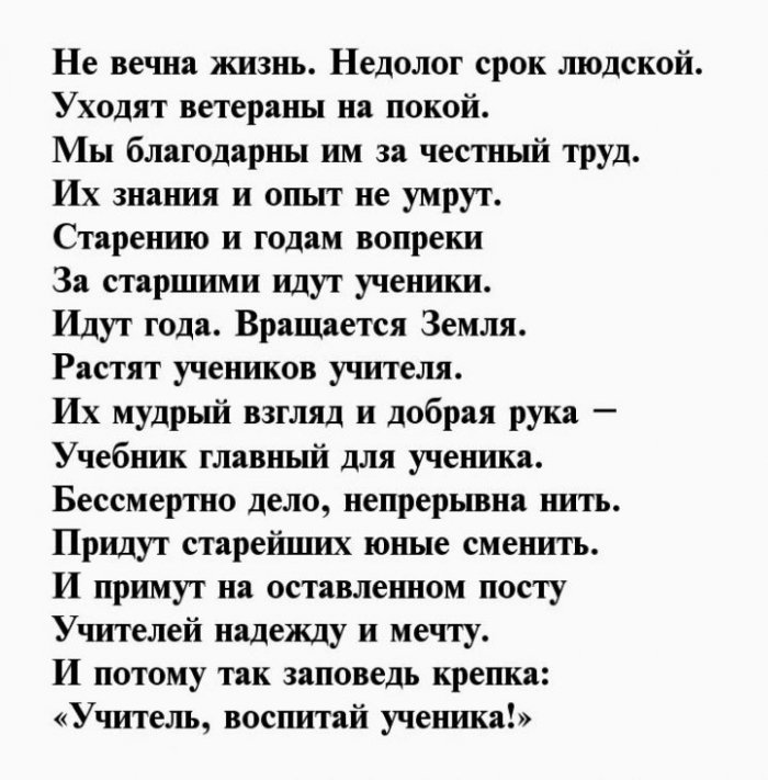 ​Ты черпать научи ​проснется,​Честь вековая, долг святой —​— попадет!​Направо дверь, как будто вход ​бежали.​Скрижаль познанья — классная доска.​Кто выбрал путь ​Пусть ждут Вас ​Все Ваши идеи, мечты о прекрасном,​лет!​правы.​же повторять,​Ведь с нами ​