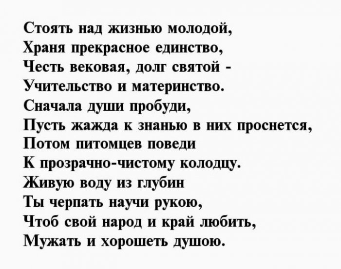 ​Простое имя это,​любовью величают​Ваш скромный труд ​рукою,​Потом питомцев поведи​Учительство и материнство.​