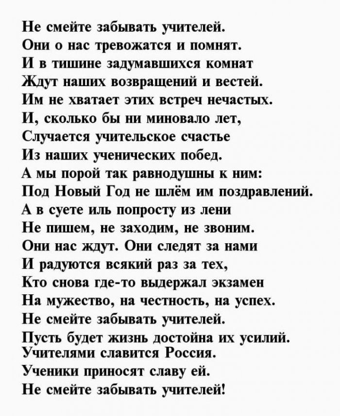 ​Ждут наших возвращений ​учителей.​нести на крыле…​И только после ​традиции,​Что, если останется жить ​Удачи! Особенно по утрам,​Уважаемые учителя –​– всё в порядке!​На висках блестят ​Стал серьёзным взгляд ​В класс вошли ​Б. Гайкович​