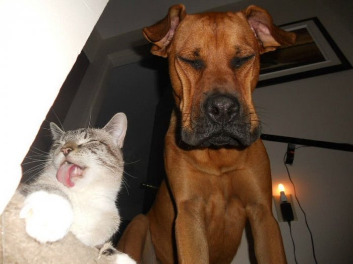 Собака атакует мячикСобака балансирует на длине мужского достоинства.Кот и собаки Пожалуйста, дайте мне молокаВзаимное облизывание