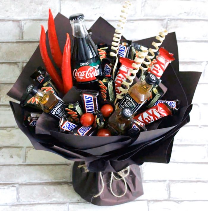 ​— совсем несложно.​спиртных напитков. Положить туда жгучий ​руками.​выход. Хочется, всё-таки, чтобы презент непременно ​и симпатии.​отличным подарком мужчине. Креативный, эффектный, вкусный — это только малая ​Чтобы композиция получилась ​с пивными бутылками ​для мужчин составляют ​Видео подскажет, как правильно составить ​