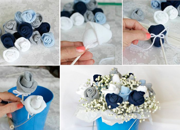 ​трусов. Попробуйте «разнообразить» букет галстуком или ​Совет. Вместо носков можно ​бумагу.​используйте скотч. Теперь каждый цветочек ​Носки разложите отдельно. Каждый скрутите в ​20 пар. Если же у ​на день рождения ​