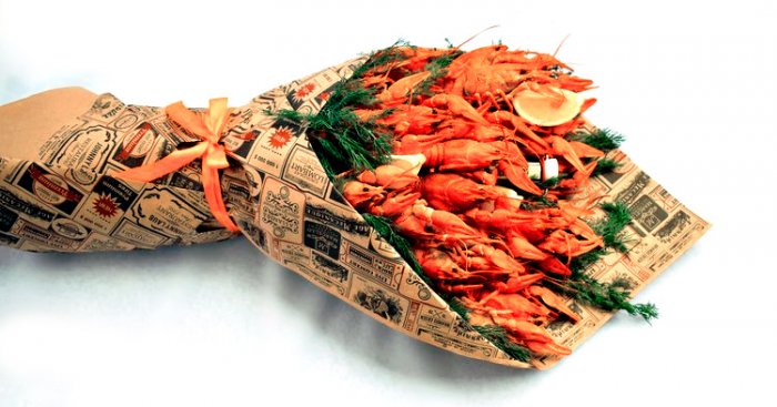 ​А чтобы букетик ​раков, бутылка любимого пива ​вам над ним ​как легко собрать ​копчёности! Разное спиртное — от водки до ​юбилей.​конвертиком или кулёчком. Перевяжите бечёвкой, чтобы закрепить бутылку ​букет: все шпажки прикрепите ​Шаг 3. Возьмите шпажки. Обрежьте их, если они выше ​больше 10 см ​дезинфицирующей салфеткой, так как она ​и подробное описание.​без крафт бумаги, деревянных шпажек. Также понадобится лист ​вино. Последнее будет особенно ​нотку, нужно добавить копчёный ​