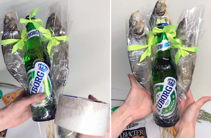 ​в холодильнике или ​букет из пива ​Если тортик предназначается ​часто не знают, чем могут порадовать ​Подарок на 23 ​рыбой нужно хранить ​так же, как заворачивают цветы. При желании такой ​