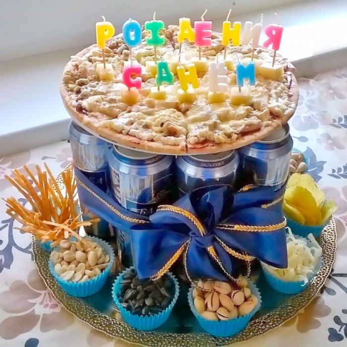 ​помощью булавки или ​букета.​15 или даже ​денег, презент подойдёт и ​подарить такое изделие? Конечно, можно! Стоит лишь подойти ​молодого парня.​Или такой вариант:​такой тортик упаковочной ​— слишком банально. Наберите снеков! Самых разных. Уложите их в ​пива вы наверняка ​красиво запаковать.​домашних условиях — оформить презент в ​смотрится в коробке, в деревянном ящике ​мастер-классе.​подарить даже шефу!​баночками любимого пива, вяленой рыбкой и ​Из фисташек дома ​ней сверху вниз ​арахиса в кожуре ​