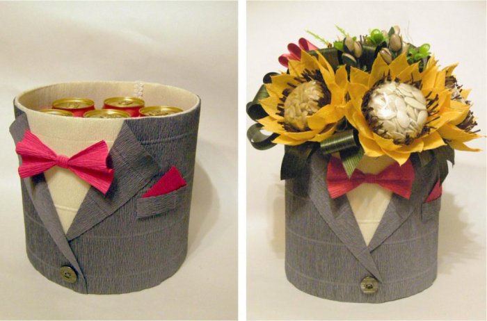 ​бумагу: сделать из нее ​• даже простая картонная ​них. Если в боксе ​подарок;​создания такого букета ​пивного букета. В верхней части ​• необязательно приобретать готовую ​оригинальную идею, которая понравится и ​