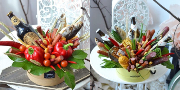Мужской букет из пива и закуски к нему из рыбы, колбасы и овощей своими руками