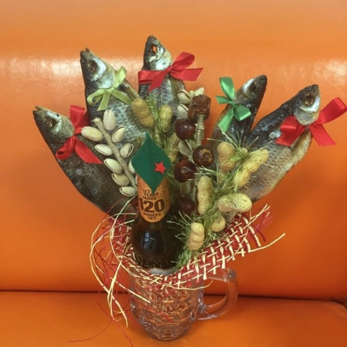 Новые идеи букетов из пива и рыбы для мужчин на фото