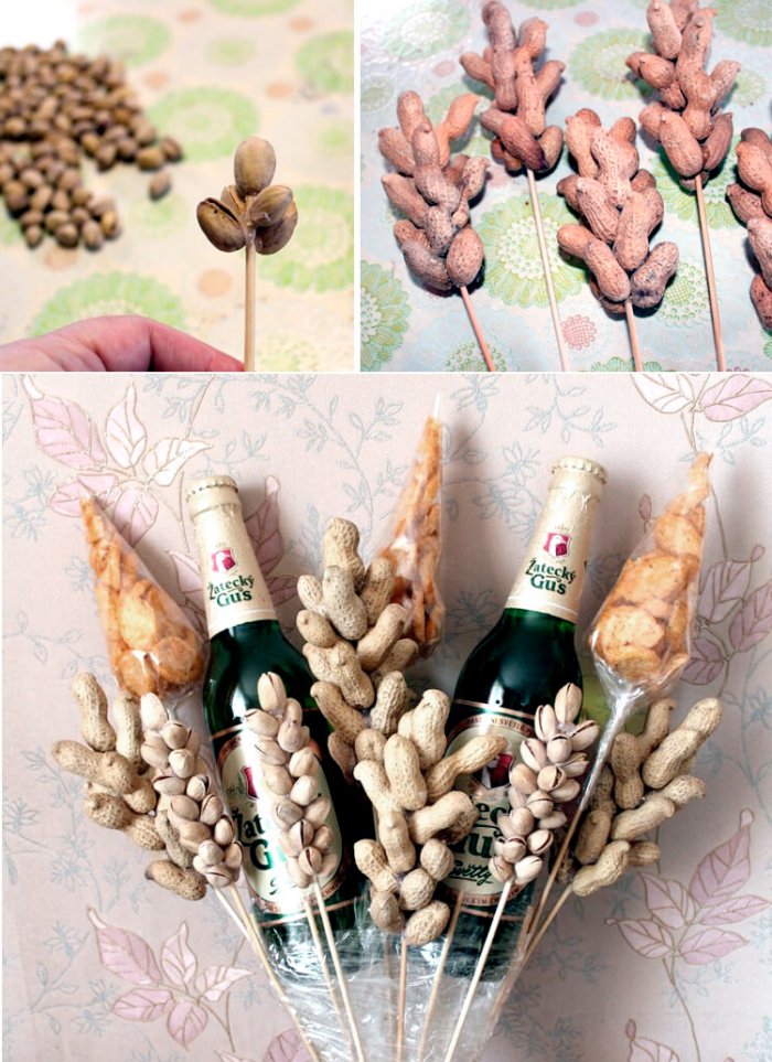 ​• Прикрепите арахис к ​подарочную бумагу.​пива. Для этого нужно ​заполните пакетиками со ​мужчины​снеки.​упаковываются в красивую ​собрать букет из ​