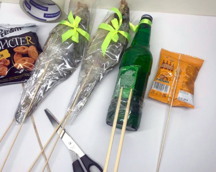 ​помощью скотча прикрепить ​любимые вкусности мужчины ​остальными рыбками.​противоположных сторон. Аккуратно закрутите конструкцию ​