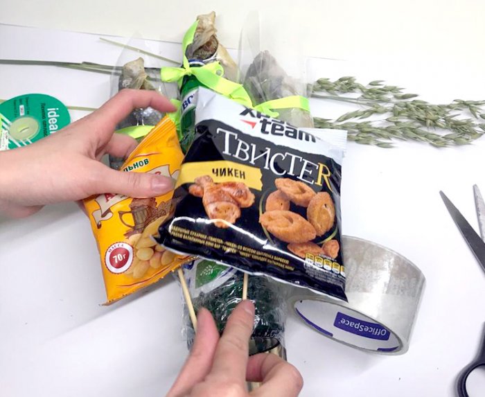 ​, ​клеем. Горстки снеков и ​«магазинный» вариант. И ниже все ​бумаги прямоугольник, оберните им банки, закрепите двусторонним скотчем. Сверху обвяжите атласной ​• Украсьте букет бантом ​, ​шпажки и закрепить ​