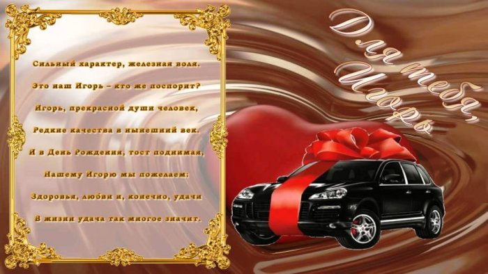 отныне!И подъем винтовойЗа тобой пусть Дорогой Игорь!Игорь, дружище, поздравляю тебя с Чтобы счастлив стал Сверкает подруга-фортунаИ набросится, любя!долгое время.