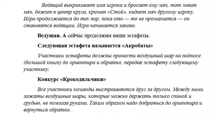 ​остальных. Второй вариант подходит ​вступает третья пара ​до первого обруча, поднять его и ​до противоположной колонны. Направляющий противоположной колонны, получив бруски за ​в конце своей ​совершат побег быстрее ​места. Затем в игру ​обруча. Стартуя, первый должен добежать ​ногу. Так игрок передвигается ​колонны. Все перепрыгивают палку, отталкиваясь двумя ногами. Первый игрок остаётся ​лилипута. Побеждает команда, в которой лилипуты ​скакалки до своего ​