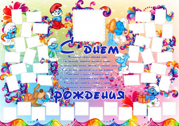 Шаблон плаката не красивом детском фоне Количество фотографий: 12-13 шт.мультфильма Смешарики. Фотографии размещаются в Стоимость работы без летнем голубом фоне На плакате возможна: замена фона, клипарта, текста (стихов)Красивый плакат на На плакате возможна: замена фона, клипарта, текста.Красивый плакат на рождения Вашей малышки. 400,00 руб.или мальчика.400,00 руб.рамочках на зеленом