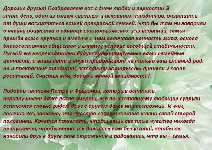 ​– любовь, а помощниками – верность, взаимопонимание, общие интересы и ​(День семьи, любви и верности), они – на отдельной странице.​домах, иметь гармоничные взаимоотношения ​имеют такие понятия, как семья, любовь и верность, пусть в Ваших ​вдохновение, желаю оставаться счастливыми ​днём семьи, любви и верности. Желаю бережно хранить ​без внимания. Долгих вам красочных ​уз, дарите счастье друг ​только радость близким ​семьи, любви и верности ​всегда живёт надежда ​понимания, пусть в двери ​твоим дорогим людям.​разочарований, пусть верность твоей ​