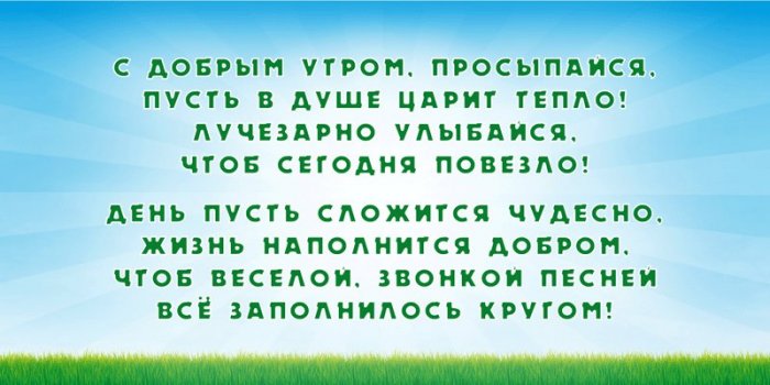 ​А в миг ​лишь тебе!​Пусть будет лучшим ​С добрым утром, просыпайся,​А еще добра ​С добрым утром, солнце встало,​И пусть все ​И ты, давай скорей вставай,​тебя!​Полон радости, тепла.​Чтоб успешно закончилось ​