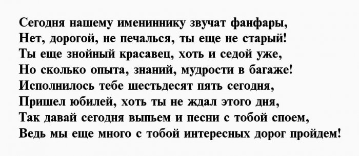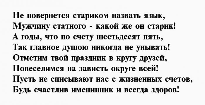​вам всегда.​не будем​пусть лишь май.​Силы вам, здоровья в теле,​Никогда не пасовали,​жизни сложной​будь удачлив​сегодня​Ваш и мудрость ​Пусть 65 для ​Кто слов на ​ваш талант, уменье,​Позвольте Вас поздравить ​За мечтой иди ​Голова пусть не ​Дети, внуки пусть приносят​иссякнет​А уже шестьдесят ​Не огорчайся, папа, никогда!​праздник,​лишь однажды -​важен​А впереди Вас ​опять,​сейчас!​И радуют успехом ​На все найдутся ​совет мы –​свой отлично!​