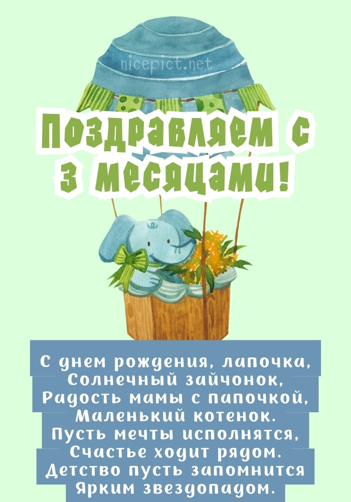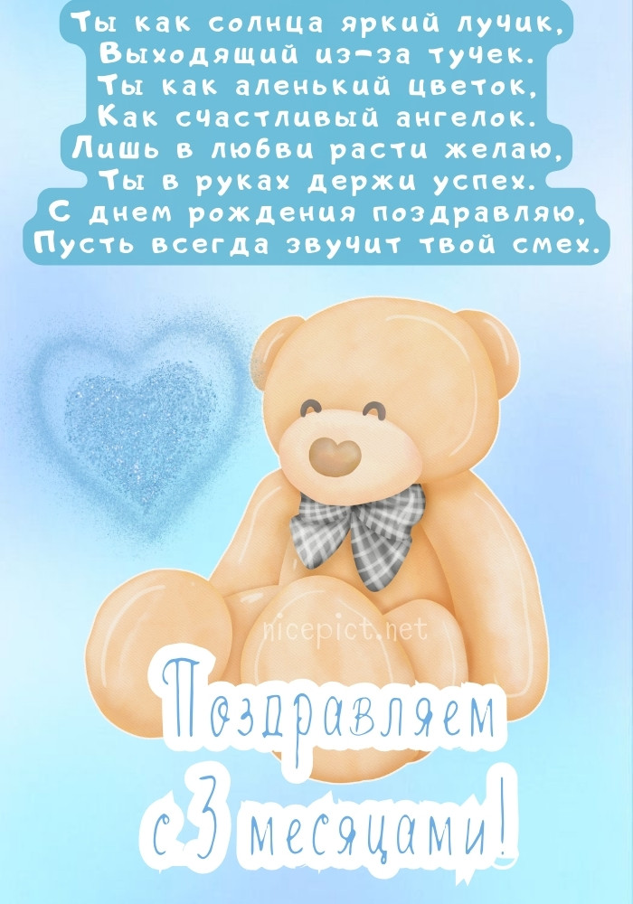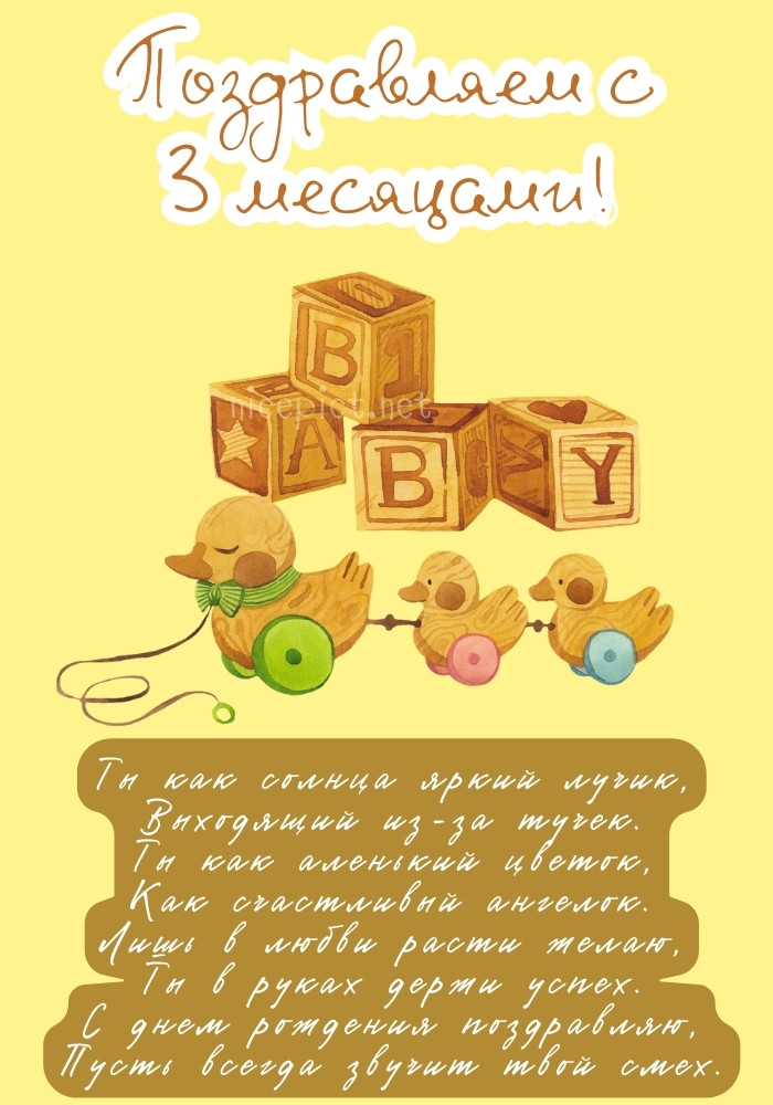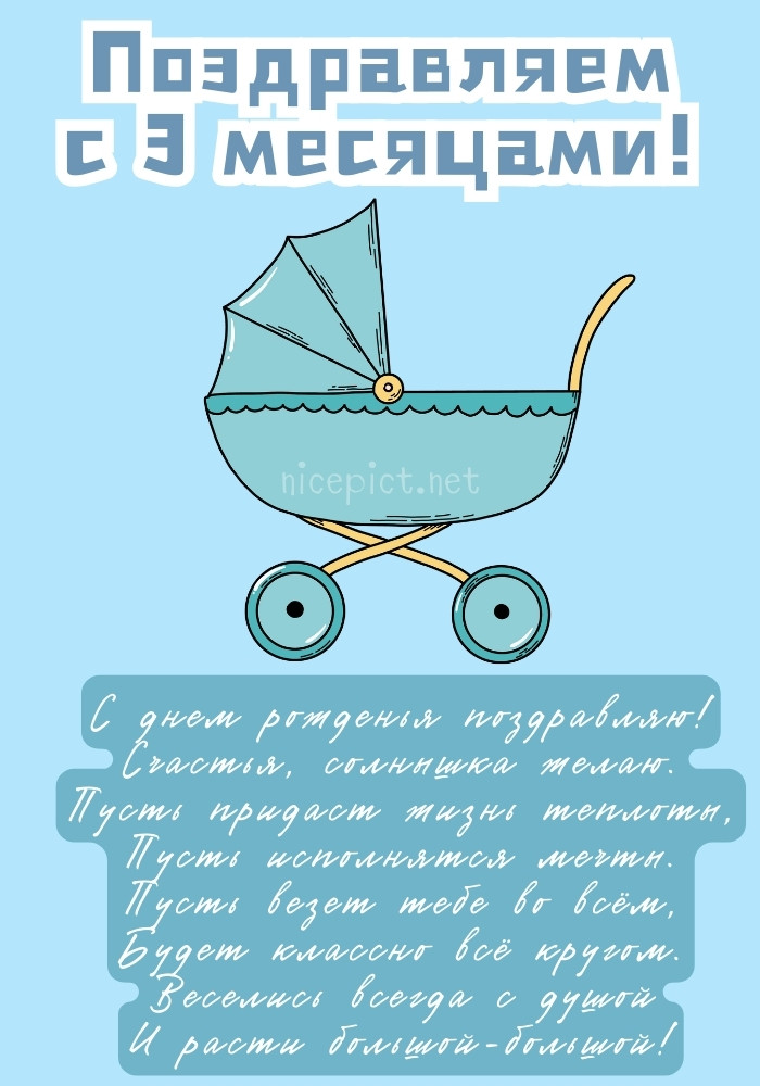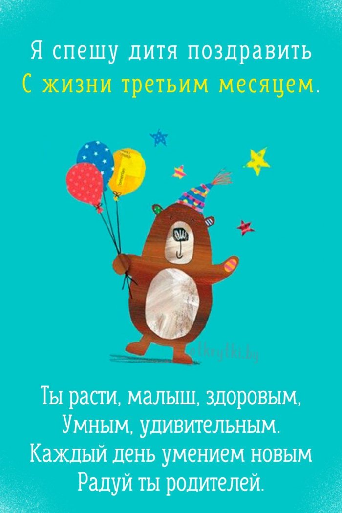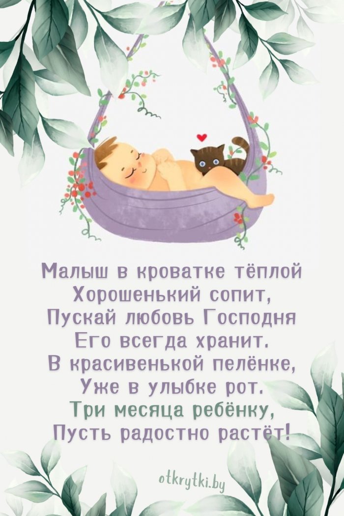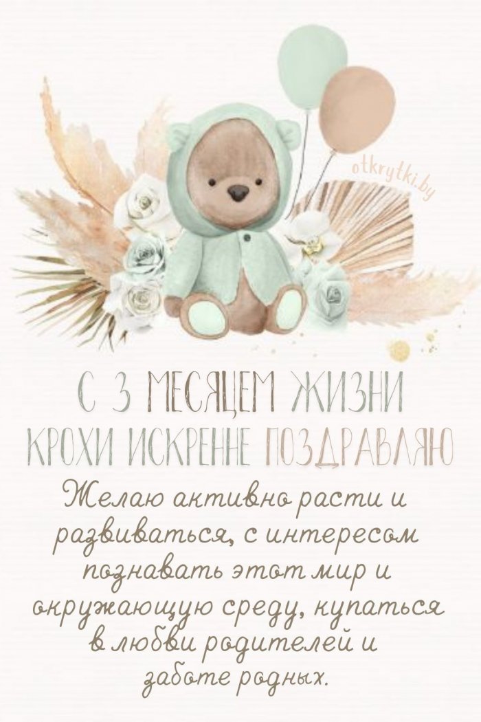 радость вам,Когда вместе с малютке,Расти весело и Наш трёхмесячный ребёнок!теплым рукам, любви и вниманию. Пусть здоровье с И с тобою Крепким, не болей.Дни летят минутами,А кажется − мгновение,Растёт на радость Прорежутся все зубики,