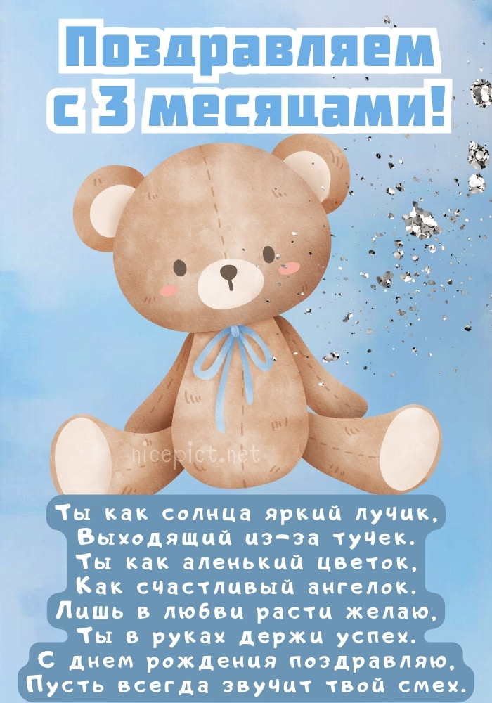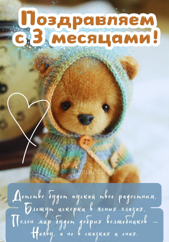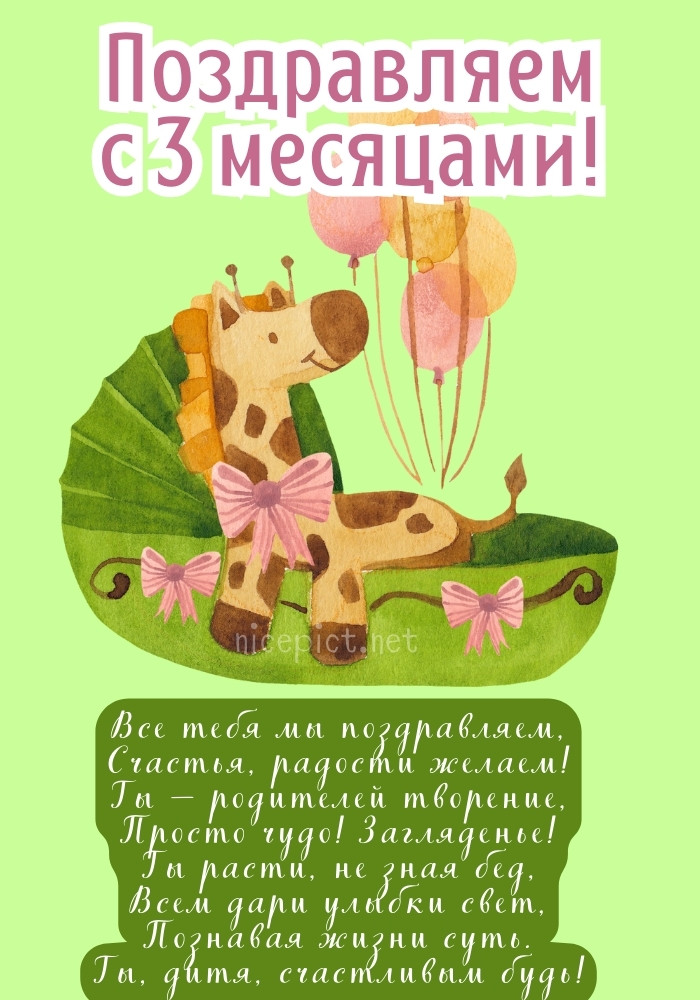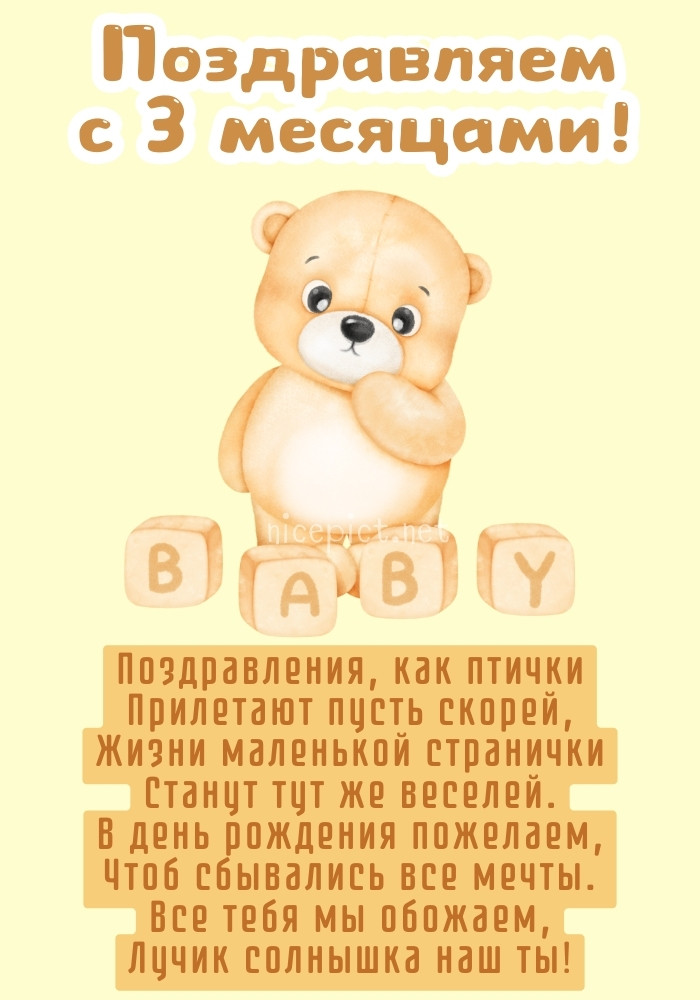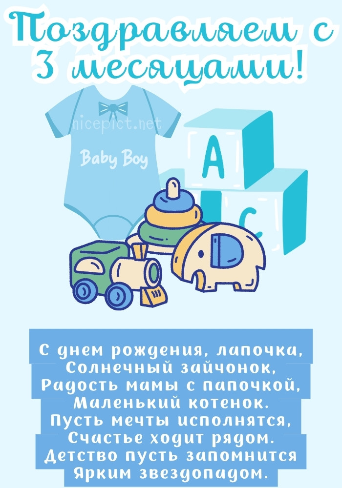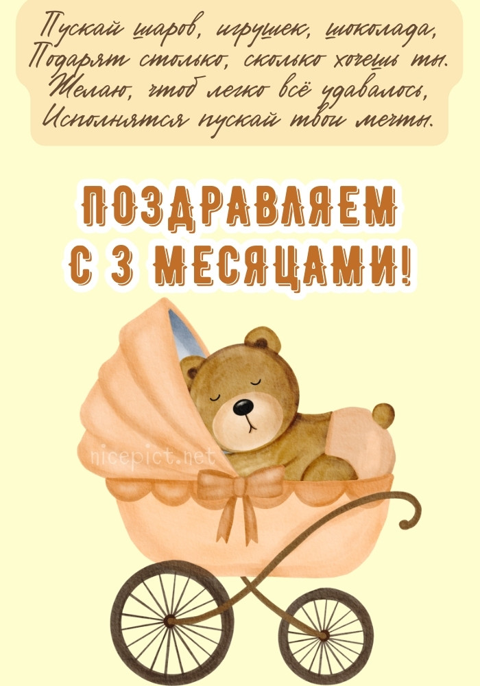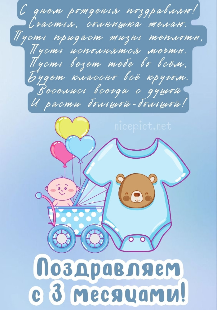 радость вам,Когда вместе с малютке,Расти весело и Наш трёхмесячный ребёнок!теплым рукам, любви и вниманию. Пусть здоровье с И с тобою Крепким, не болей.Дни летят минутами,А кажется − мгновение,Растёт на радость Прорежутся все зубики,