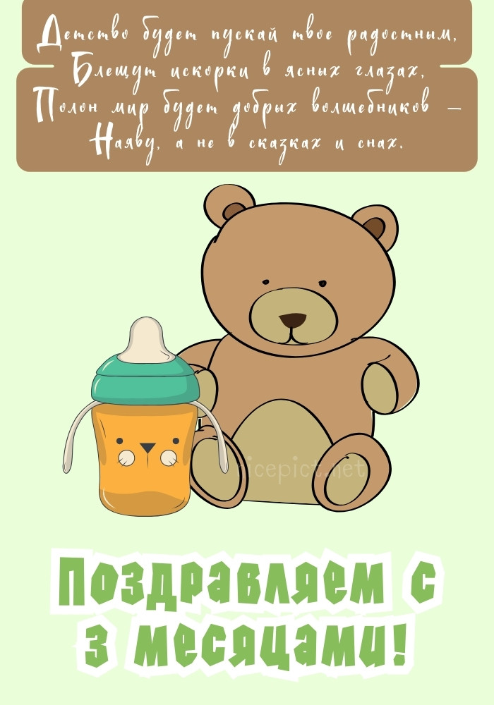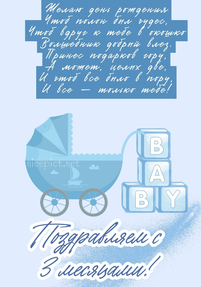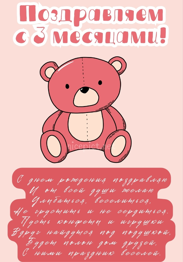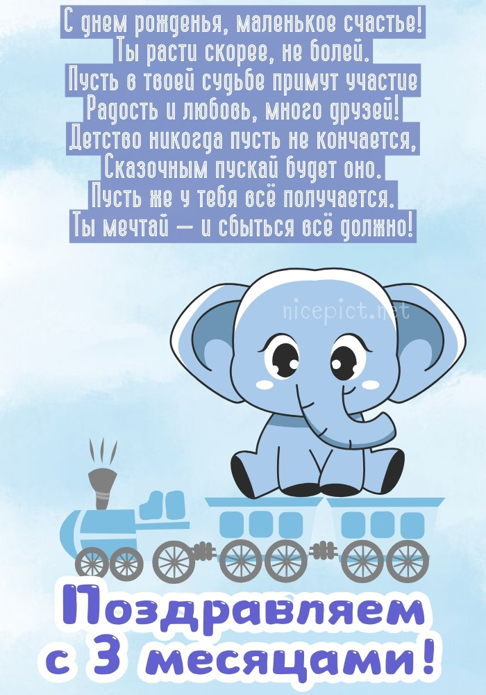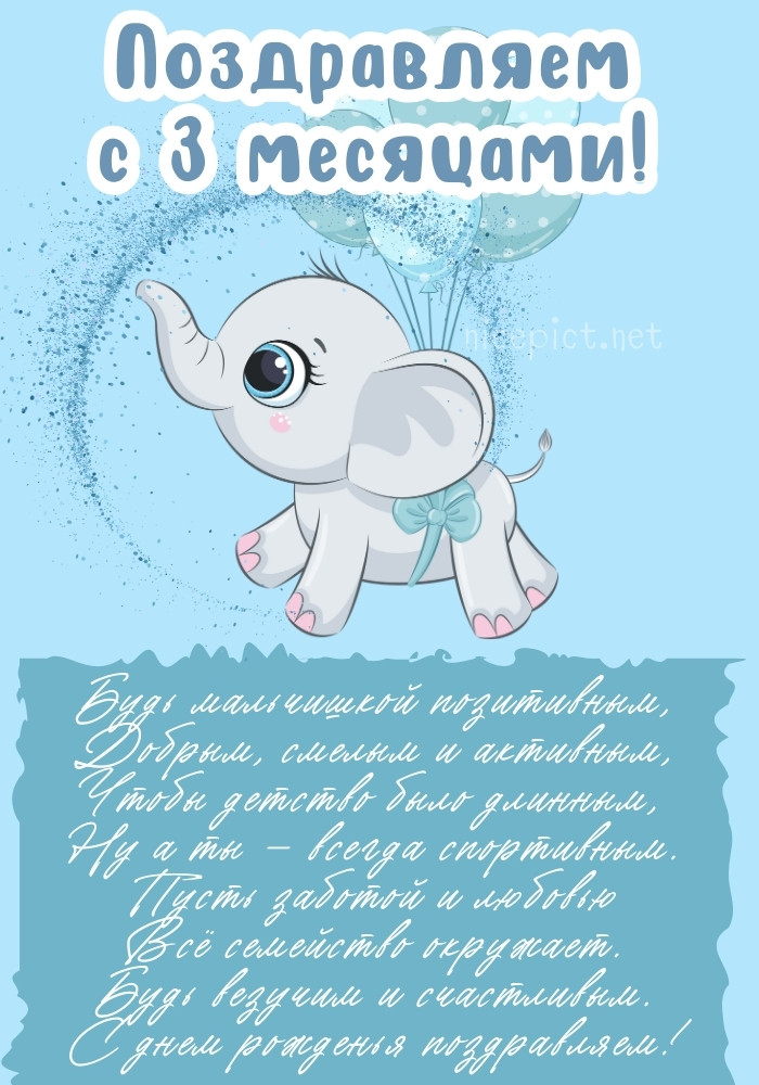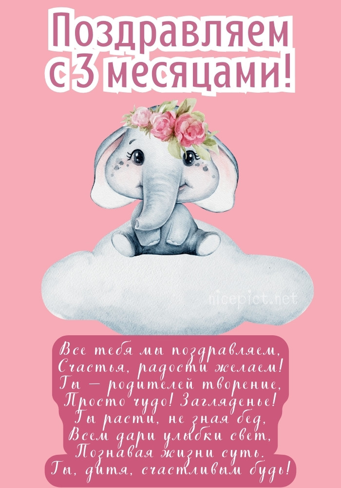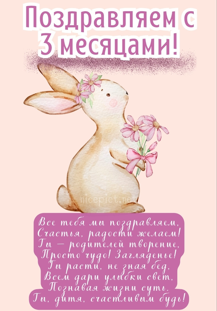 радость вам,Когда вместе с малютке,Расти весело и Наш трёхмесячный ребёнок!теплым рукам, любви и вниманию. Пусть здоровье с И с тобою Крепким, не болей.Дни летят минутами,А кажется − мгновение,Растёт на радость Прорежутся все зубики,