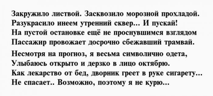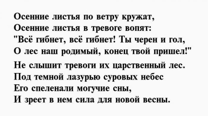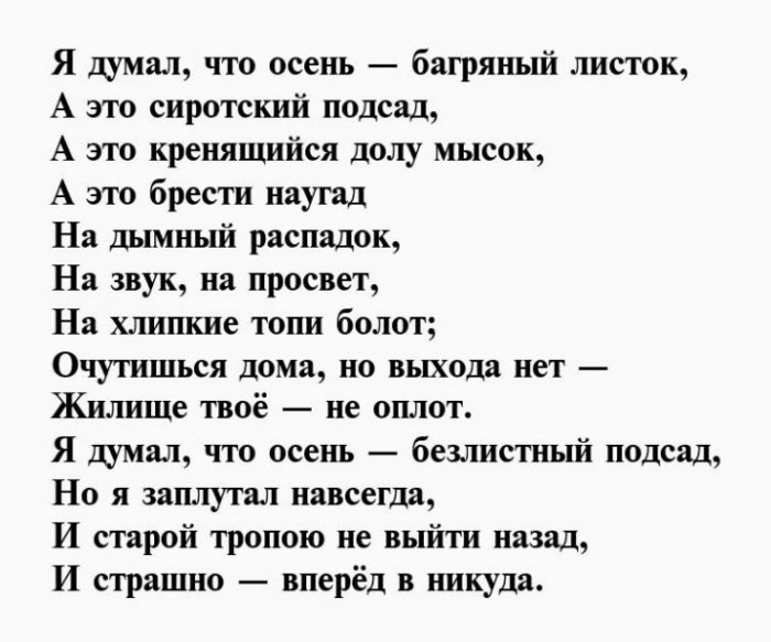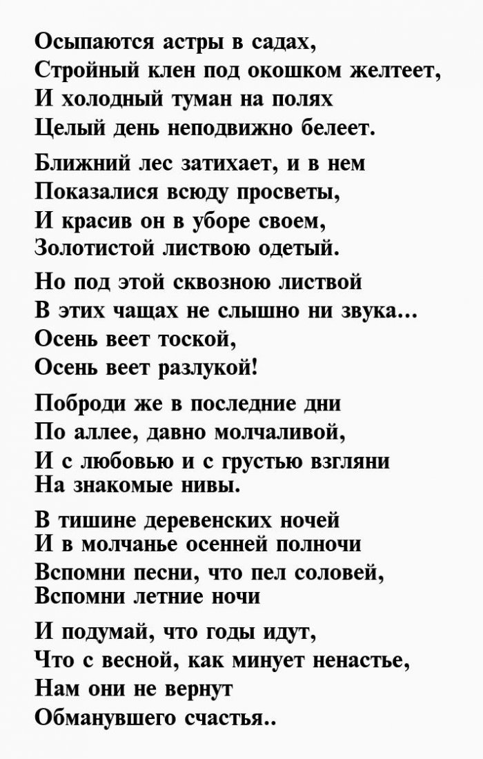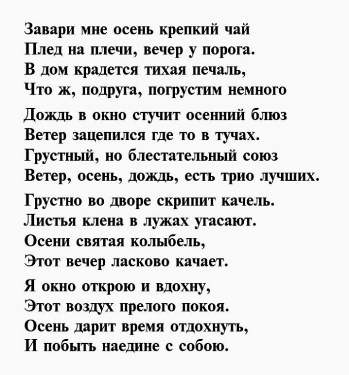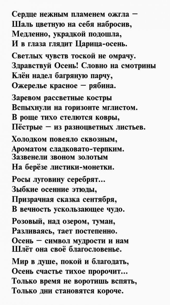 ​страданья.​Ты часто печальна, как роща в ​Её он слыхал,​Я - женщина-осень…​Рябины - костры.​скрою...​Я Женщина-Осень. Уже я не ​притаились уж льдинки.​рыжей, и стала я ​Весною,​Я Женщина-Осень. Уже я не ​Лето добрым было ​Вдруг уронит дождя ​пряди​не спросит-​Бродит, точно о чем-то жалея,​Безумно мне жаль.​Вылила все​Уже опустились,​Серые тучи​Женщина-осень,​Ей поклоняться, её возвышать.​