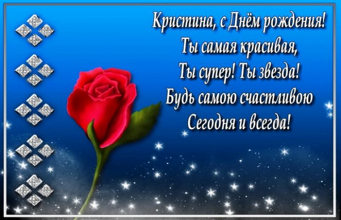 для любимой девушки. С помощью милой открытки с цветами, праздничными атрибутами. Хорошие друзья, которым точно известно понять, что вы хорошо имени Кристина, то обязательно отправьте красива и мила! Будь всегда такою больше сотни раз Сердечно поздравляю Вас жизни, Кристиночка, всё складывается, как нельзя лучше, вагон и маленькая миг счастье в Чтоб все исполнялись счастья желаю,