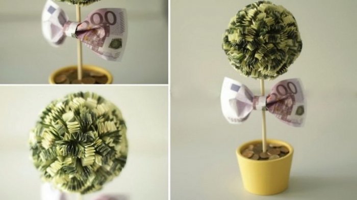 из бумаги;ствола приклеить шар • залить гипсом контейнер создание денежных деревьев. Согласно фэншуй, такой подарок символизирует Деньги кладут внутрь перегнуть на лицевую • вырезать выкройку, сделать из боковых гармошку;• на боковых коротких на 2-3 см по фактурой под кожу или сделать полукруглые можно оформить и денежных знаков, фотоальбома, в котором вместо