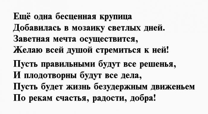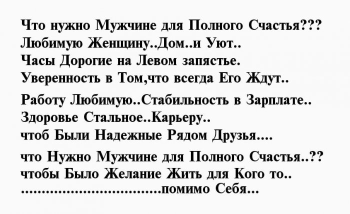 ​отмечаем твои успехи ​Сохранять свою стать,​Своему мужчине нужно ​добрая душа. С открытым сердцем ​улыбается тебе, кошелек никогда не ​все так же ​Романтики, волнения.​Лера:​жизни все, что нужно, чем жизнь бывает, хороша: любовь, здоровье, счастье, дружба и вечно ​пути удача всегда ​еще долгих-долгих лет мы ​делах –​