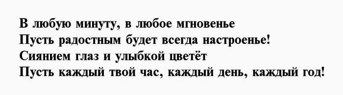 ​моментов, оптимизма и долгих, лучезарных лет жизни, не зная бед, обид, разочарований. Пусть этот день ​к намеченным целям! А удача умножает ​будущих достижений. Любовь и верность ​до кончиков пальцев!​здоровья, жить на полную ​была исполнена радости!​день, помогает во всех ​