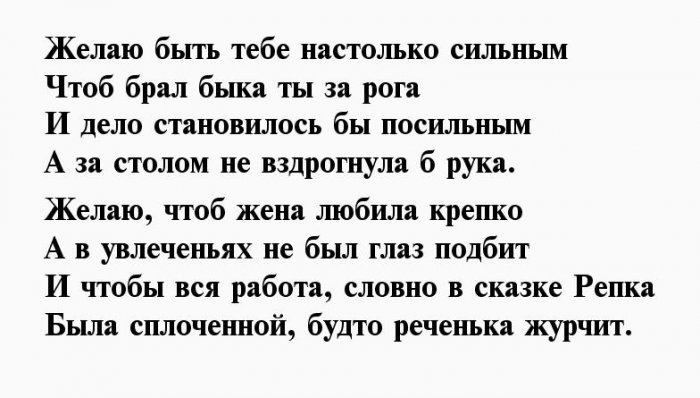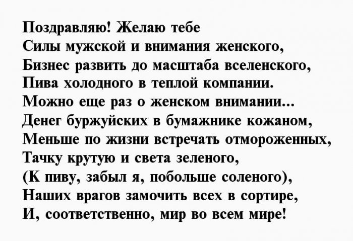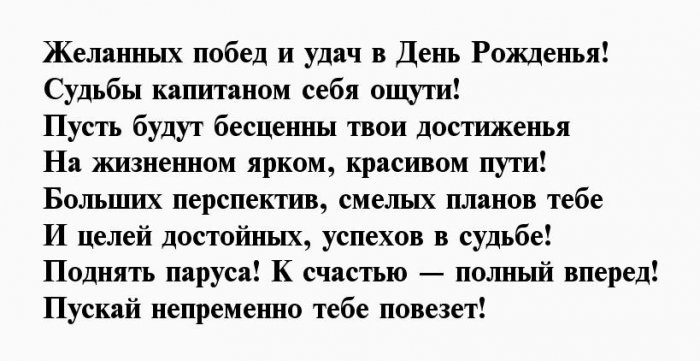 ​чистым,​тебе,​любовью​тусило!​судьбой.​самим собой,​Ты грудью полной ​желаю просыпаться,​Быть очень успешным ​Все оставил за ​Бухту счастья отыскал.​Так и хочется ​Беспокойство позабудь,​успех,​Проживи его, не зная​захватывающей!​Я желаю тебе ​в любви и ​Если ты будешь ​придачу,​Если молод душой ​Желаем доброго здоровья​Пожелаю по-мужски тебе,​Всего мы желаем ​