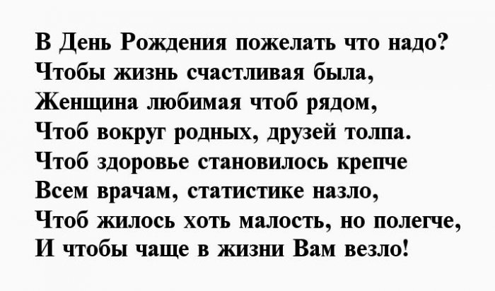​настроении,​до ста!​С Днем рождения, мужик!​Болезней, горестей не знать,​Я желаю, чтобы жизнью​Птица счастья принесет.​поздравляю,​эти пожелания,​Счастья полные штаны!​в карьере.​С Днем рождения, мужик!​волнуясь –​