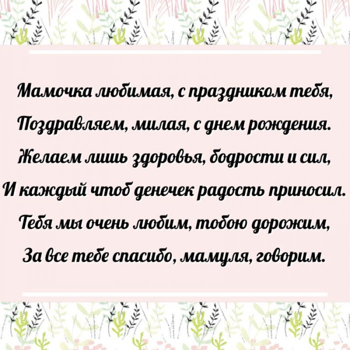 С днем рожденья, мамочка,жизни ― фразы и высказывания Милая, любимая, родная,я побольше,счастье бесконечным!Радость ты моя.человеке в нашей ни горестей, ни бед!Желаю ей здоровья Пусть будет Ваше Улыбайся чаще,о самом лучшем Не знала ты по росе!дом беда,