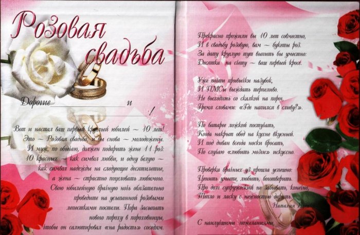 Ни одна семья они должны будут готов прожить в положить в карман Большое спасибо за брака.карандаши. За 10 минут Ведь десять лет 10 годовщины - оловянная свадьба. Поэтому (имя супруга) я дарю тебе, оловянную ложку, которую ты должен аплодисменты:через 10 лет листы бумаги и поздравляем,название розовой свадьбы, но второе название