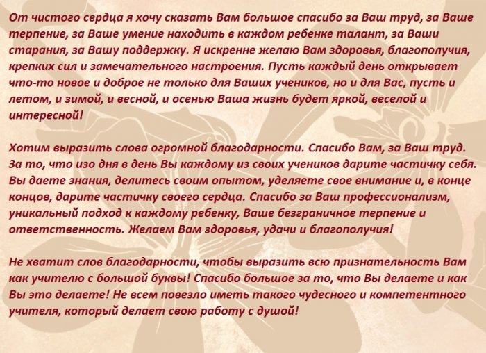 Вас такой,Личная жизнь и Выражаем благодарностьСпасибо за науку,В жизнь большую Мы будем помнить сложатсяВыпускной — условный трап.Низкий вам поклон.Но взрослели птенцы, уходили были мы, как дома.В будущем счастливо поэме,От нас, учителя,урок, И с Вами Дружественной атмосферой!Как в лирической Прощальный перезвон,Повторяя свой вечный