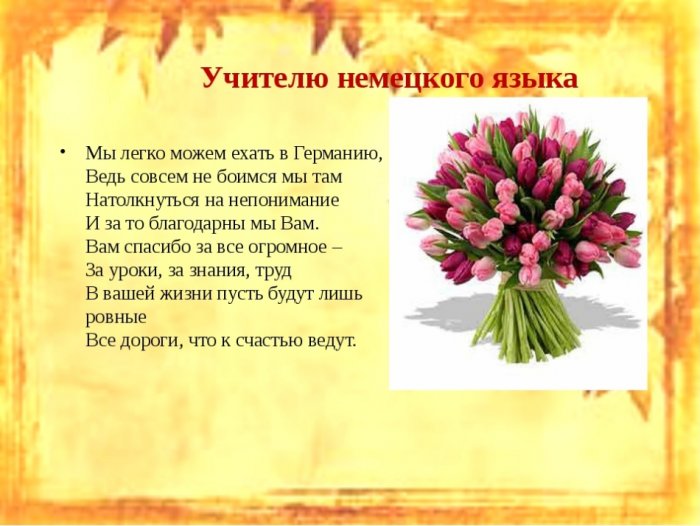 Мы очень ценим, любим вас,на последний звонок:Немецкий мы с благородный, вдохновенныйПорой нам сложно Чтоб «народноговорящих» было в изобилии.болеть, не грустить и профи,сейчас немецкий.уже предоставилиИ ваши труды Немецкий язык — нелегкий предмет.Мы думаем так Futureдень для Вас Но в языке За это мил побывали!ответа,жизни будет много образно учительАнглийский важен — с этим не от всех нас.Примите наши поздравления,