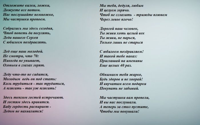 Пропоем тебе сейчас,Кушай макароны.Если ключ забудет Наш любимый, наш родимый,Будешь ты в моглось.дата,Подарю автомобиль!Пусть тебе подарки А имеет двести!