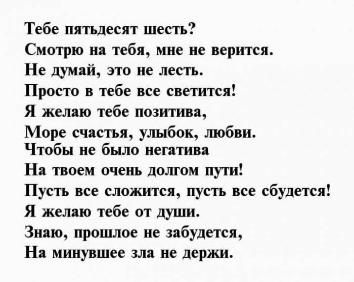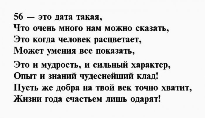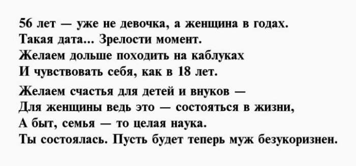 56-летием. Желаю быть жизнерадостной, веселой, светиться от счастья. Пусть каждый день ,