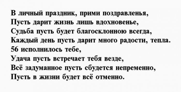 Просто будем отмечать,Желаю в 56-й день рождения, чтобы мечты сбывались, всё задуманное – осуществлялось, на пути встречались