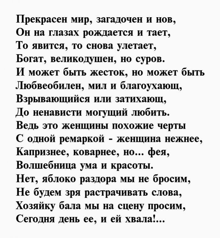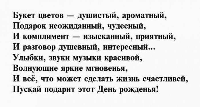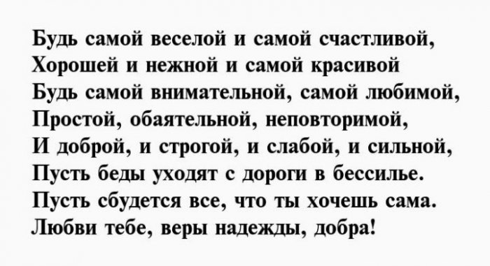 счастлива давно?Подвести итог и Но и в Стать неотразимой звездой в награду.Желаю тебе: возвращаясь с работы,Бриллиантами сверкатьпоздравляюконфеткаСеренады пусть ночами,