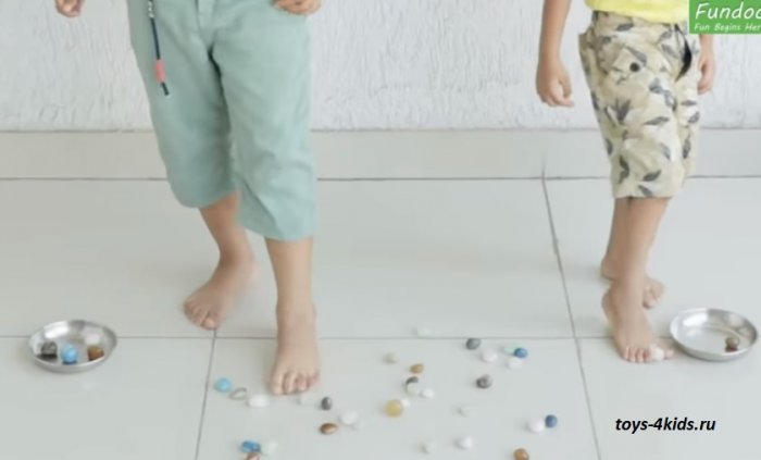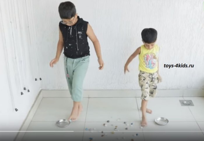 , разбросаны предметы, например, фишки, спички, карты. По команде «старт» ребята из пары