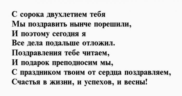 Пусть везет в Новый будет пусть С днем рождения ненастья,лесть.В сорок два все прекрасно,самом разгаре, будь уверен! С Днем рождения!всегда присутствует уважение, везение и достаток.