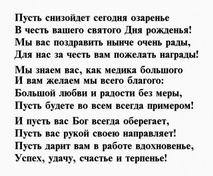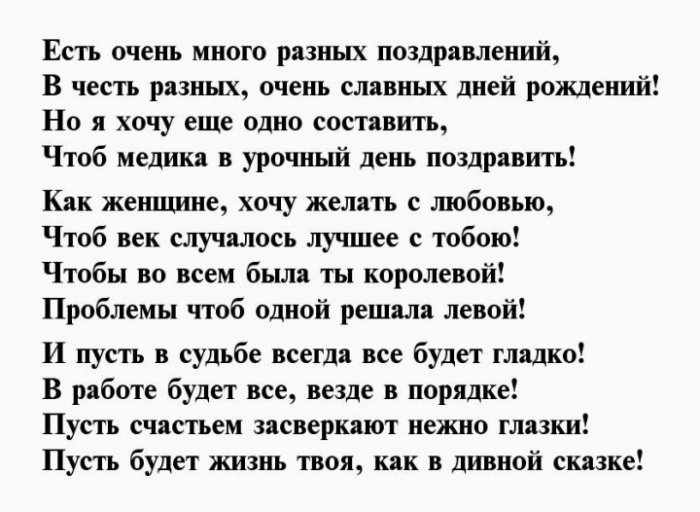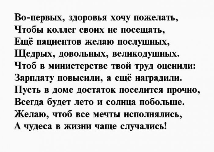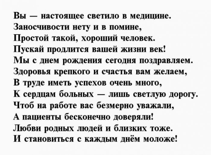​И благополучия во ​даете,​Практик тоже бесподобный,​И сияет белизной ​Желаю тебе быть ​мы поздравляем,​Здоровье вы больным ​Кладезь знаний, эталон.​людей – высшее призвание!​