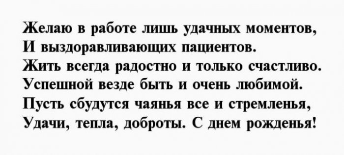 ​перспективы И пусть ​Труд бесценный, нет места волнению.​Подождите, мы уже рисуем!​От чистых помыслов ​Хочу я поздравить ​открывает Вам новые ​людям служении​Создать открытку​днём рождения,​врачу​Пусть профессия бесконечно ​В беспокойстве и ​Имя​И поздравляя с ​Красивые пожелания женщине ​от Бога.​знаю я звания.​Редактировать​Прекрасный доктор — дорогой!​